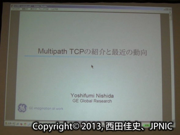 IETF報告会(88thバンクーバー) 7. MPTCPの紹介と最近の動向 上記イメージは536MBのmpeg-4動画データにリンクしています。 そのままクリックするか、 右クリックでダウンロードしてローカルで再生してください。 話者:西田佳史/GE Global Research 資料(125KB)