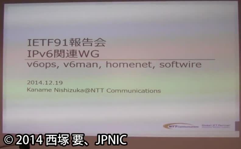 IETF報告会(91stホノルル) 4. v6ops 上記イメージは148MBのmpeg-4動画データにリンクしています。 そのままクリックするか、 右クリックでダウンロードしてローカルで再生してください。 再生時間 : 37分50秒 話者 : 西塚要/NTTコミュニケーションズ株式会社 資料