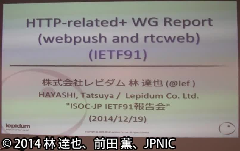 IETF報告会(91stホノルル) 7. Short session 上記イメージは103MBのmpeg-4動画データにリンクしています。 そのままクリックするか、 右クリックでダウンロードしてローカルで再生してください。 再生時間 : 25分28秒 セッションコーディネータ:林達也/株式会社レビダム 資料1 資料2