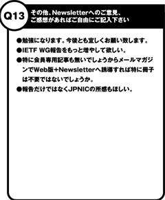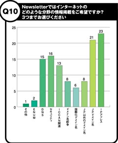 2003年3月に発行したNewsletter No.23において、読者アンケートを実施しましたので、その結果をお伝えします。2002年7月発行のNewsletter No.21より、デザイン、内容面のリニューアルを行っていますが、アンケートの結果、皆様より概ねご好評をいただいていることが分かりました。また、掲載の記事については、インターネットの統計情報の充実を望む声が多かったため、早速本号より統計情報をパワーアップしました。今後とも皆様からのお声をもとに、より読みやすく、お役にたてる情報をお届けしてまいりたいと思いますので、どうぞよろしくお願いいたします。