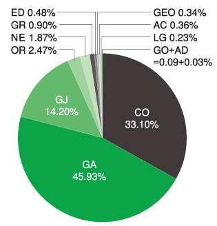 2007年7月1日現在の登録ドメイン名を属性別で円グラフにしたものです。最も多い属性は、汎用JPドメイン名(GA)で45.93%、次いでCO、汎用JPドメイン名(GJ)、OR、NEの順となります。