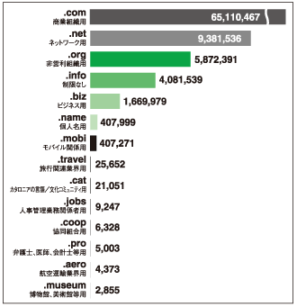 分野別トップレベルドメイン(gTLD:genericTLD)の登録件数です(2007年2月現在。.aeroは2006年12月、.museumは2005年12月。)データの公表されていない、.edu,.gov,.mil,.intは除きます。