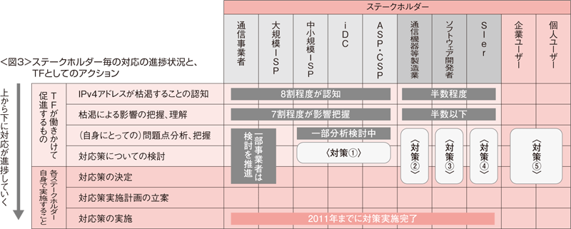 前述のような現状把握に基づいて、ステークホルダー毎の対応進捗状況と、今後TFあるいはJPNICとして実施すべき取り組みを示したのが、図3です。