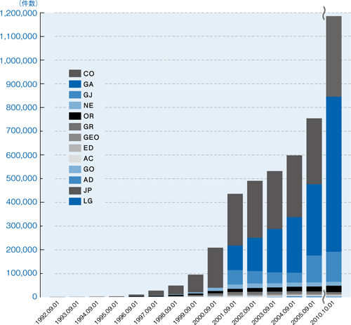 JPドメイン名の登録件数は、2001年の汎用JPドメイン名登録開始により大幅な増加を示し、2003年1月1日時点で50万件を超えました。その後も登録数は増え続けており、2008年3月1日時点で100万件を突破、2010年10月現在で約118万件となっています。