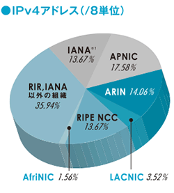 各地域レジストリごとのIPv4、IPv6、AS番号の割り振り状況です。APNICはアジア太平洋地域、ARINは主に北米地域、RIPE NCCは欧州地域、 AfriNICはアフリカ地域、LACNICは中南米地域を受け持っています。2011年2月3日に、IANAからRIRへのIPv4アドレスの新規割り振りは終了しています。
