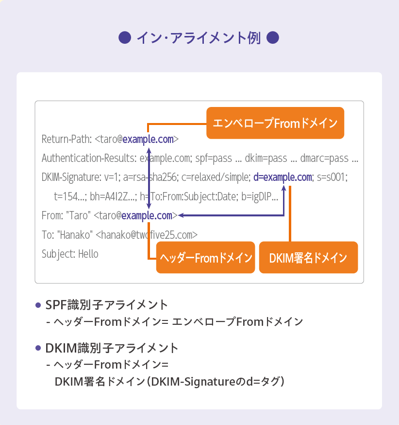 また、真正のメールであるかどうかのDMARCによる判定は、 前述のSPFとDKIMの判定結果を利用して「いずれか一方が成功している」ことが必要ですが、 加えてヘッダーFromドメインと認証対象ドメインが一致することも求められます。 具体的には、SPFの認証が成功した場合はエンベロープFromドメインとの一致性を、 DKIMの認証が成功した場合は署名ドメインとの一致性を必要とします。 これにより、結果としてDMARCではヘッダーFromドメインの保護につながるのです。 なお、この一致性を「アライメント」と呼びます。