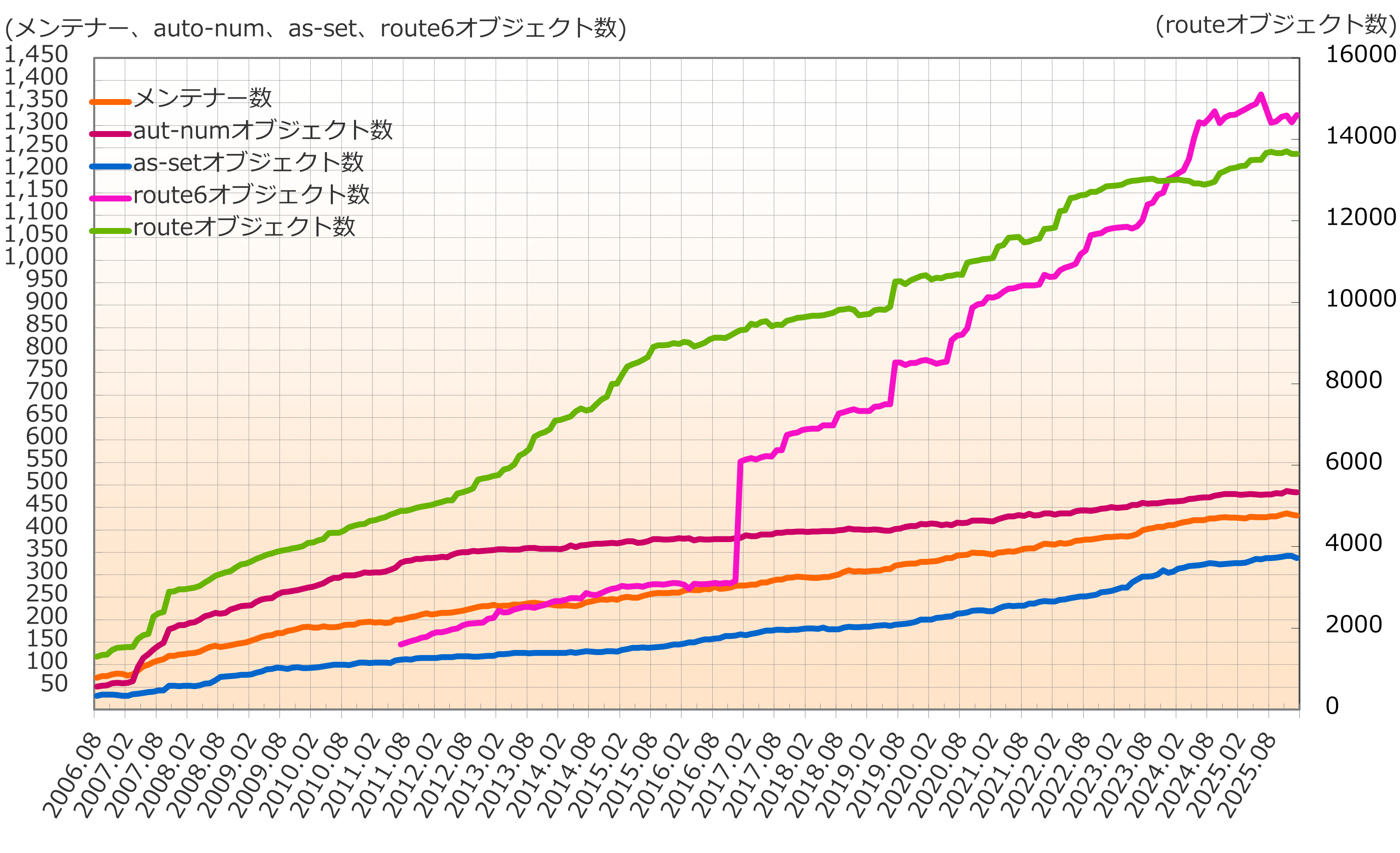 JPIRRにおける各オブジェクトの登録件数の推移です。 JPNICでは、JPNICからIPアドレスの割り振り・割り当て、 またはAS番号の割り当てを受けている組織に対し、 2006年8月よりこのサービスを提供しています。