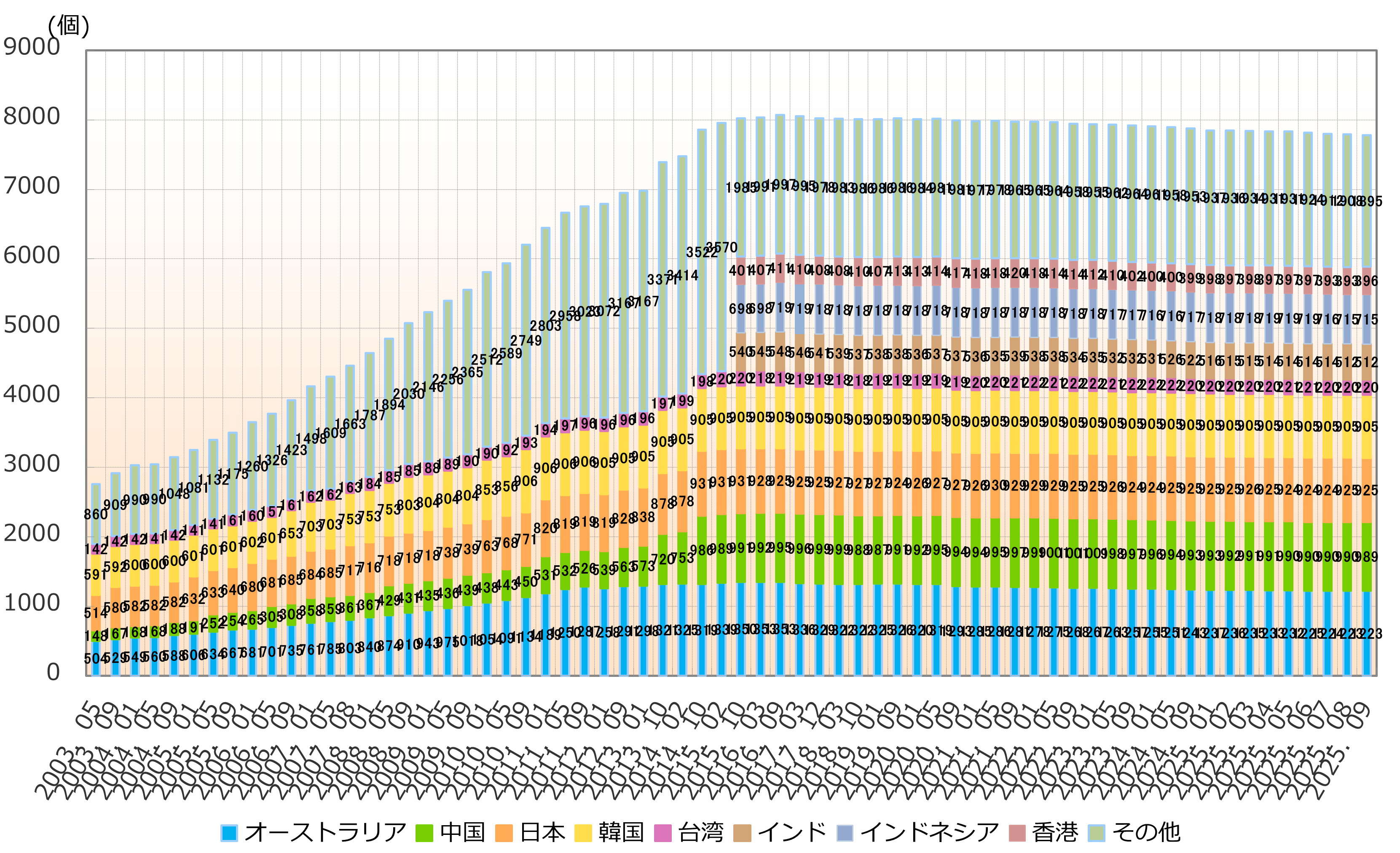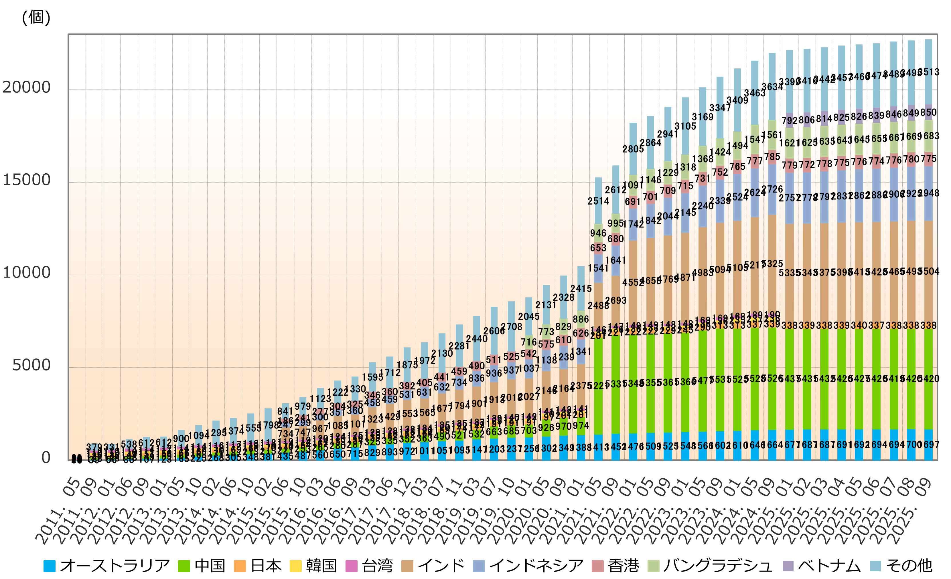 APNICからローカルインターネットレジストリ(LIR)へ割り振られたIPアドレス・AS番号と、 APNICから直接割り当てられたIPアドレス・AS番号の合計をアジア太平洋の主要地域別に示しています。 (最終更新日2025年10月7日)