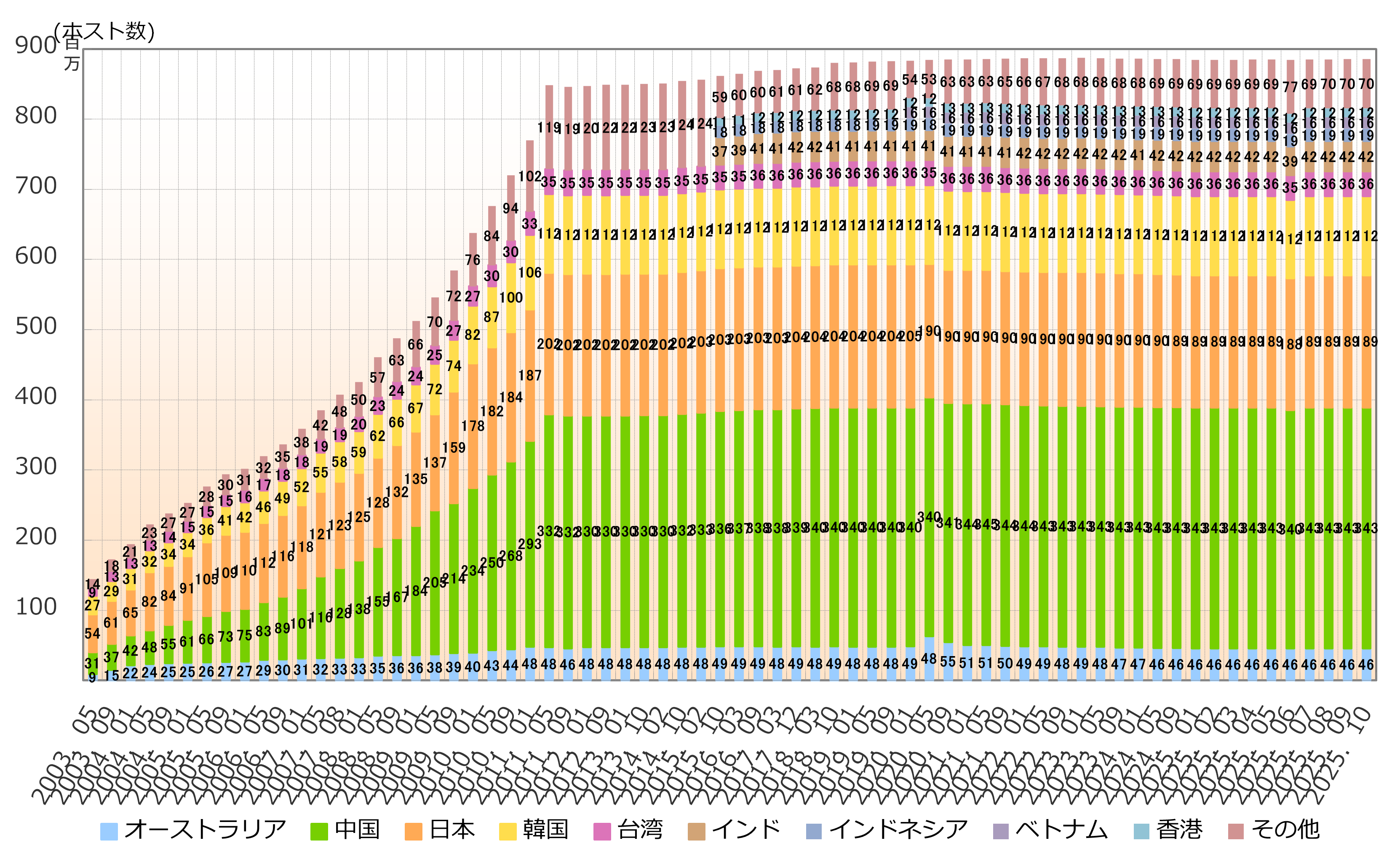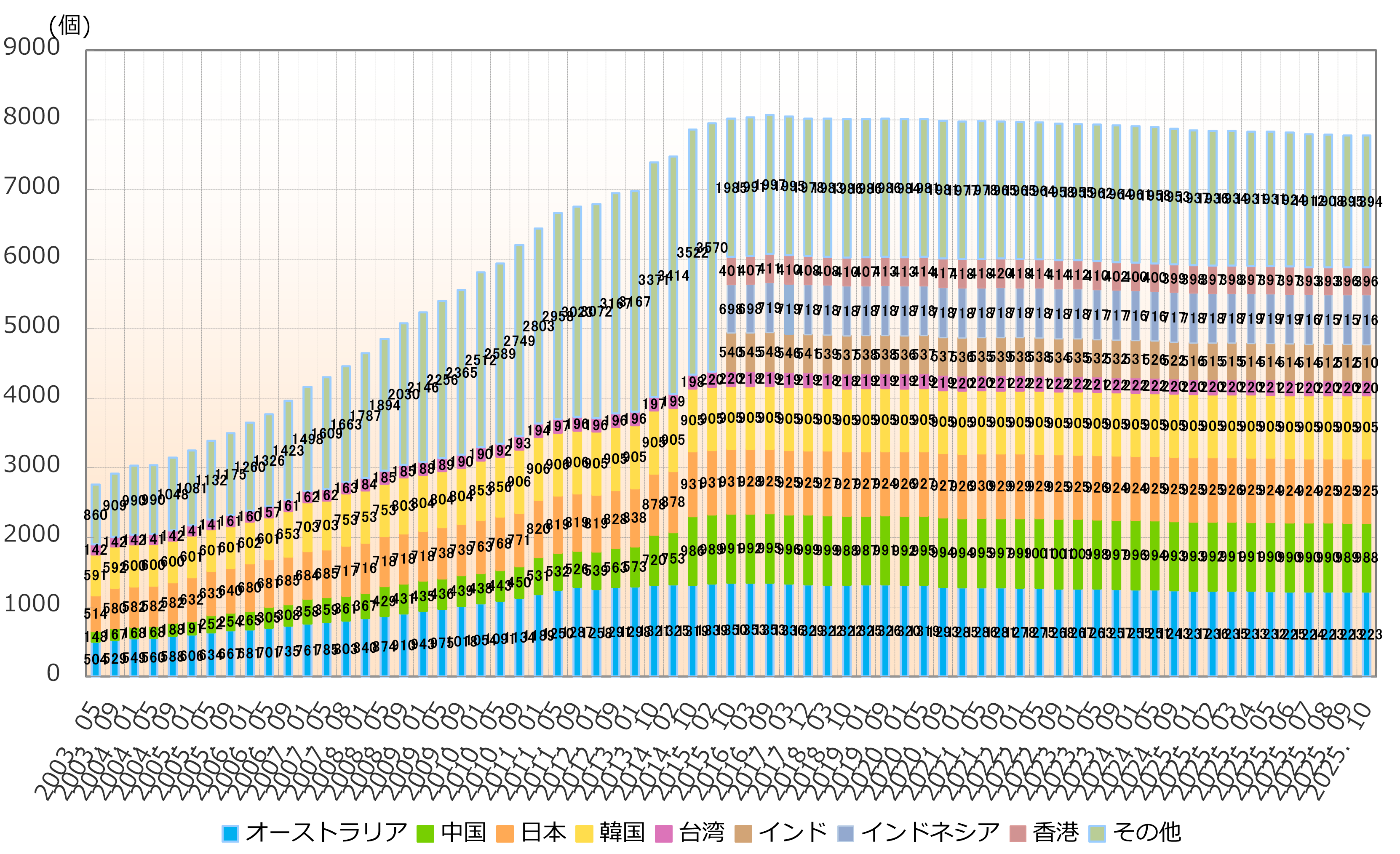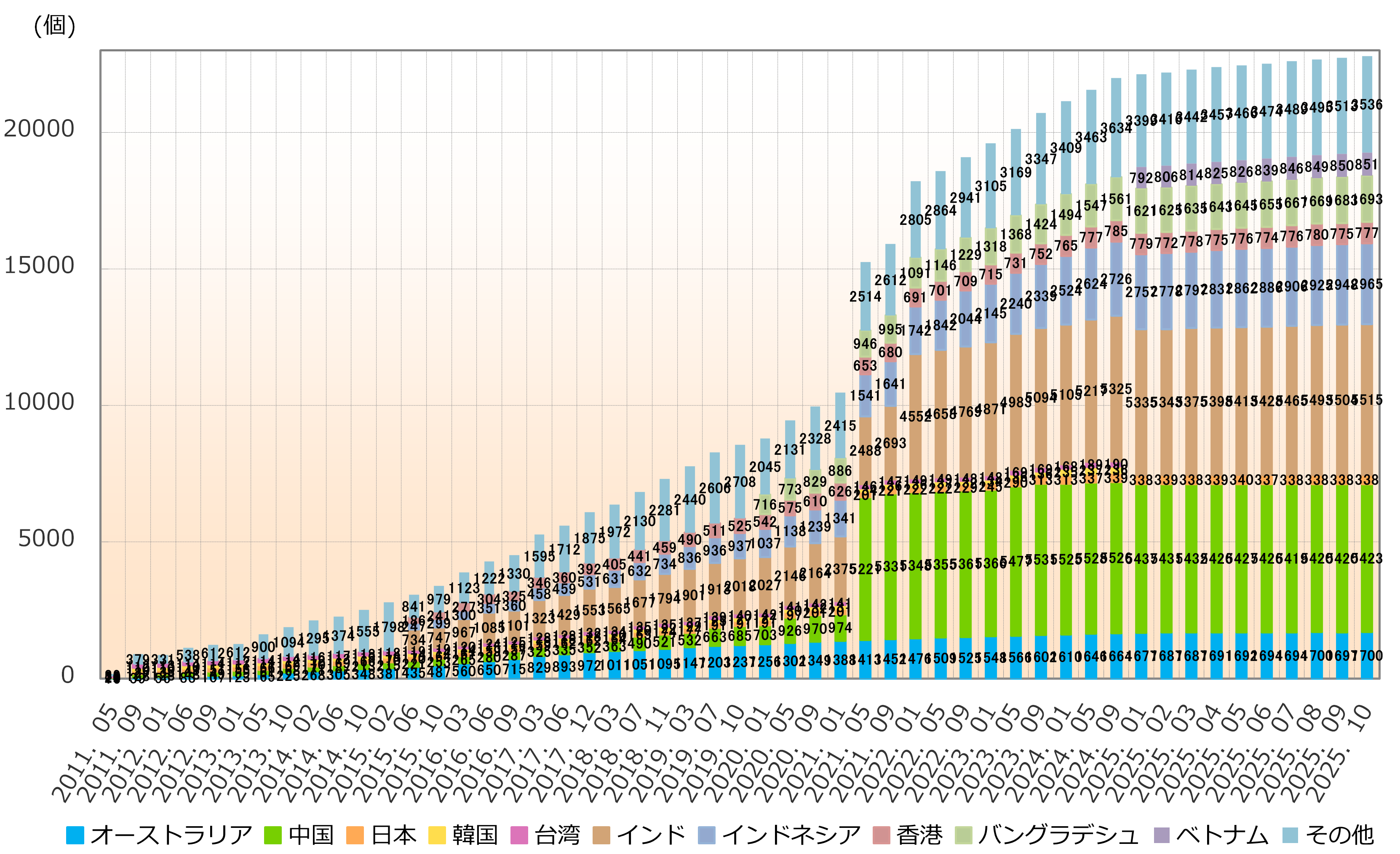 APNICからローカルインターネットレジストリ(LIR)へ割り振られたIPアドレス・AS番号と、 APNICから直接割り当てられたIPアドレス・AS番号の合計をアジア太平洋の主要地域別に示しています。 (最終更新日2025年11月7日)