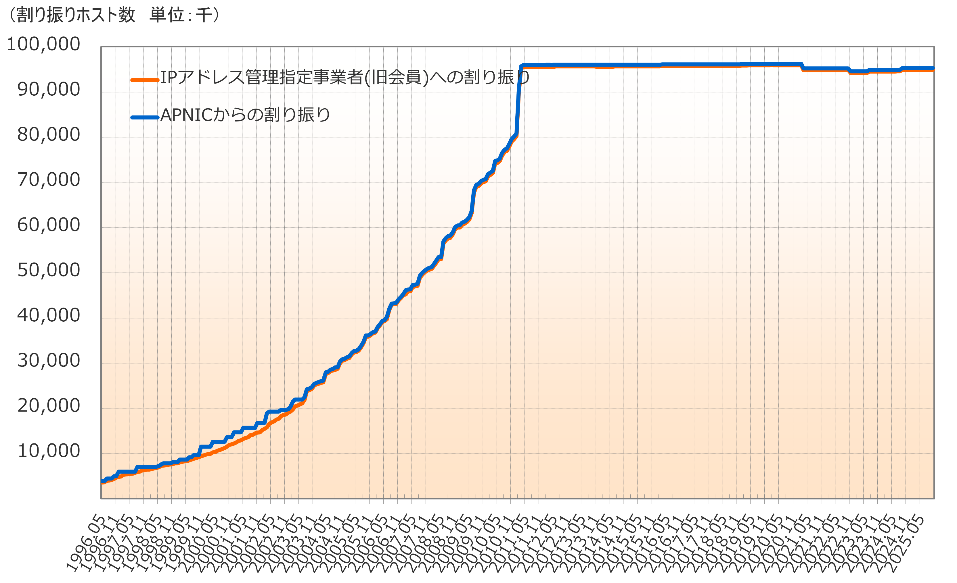 IPv4アドレスの割り振りホスト数の推移を表したグラフです。 JPNICでは必要に応じて、 APNICよりアドレスの割り振りを受けています。