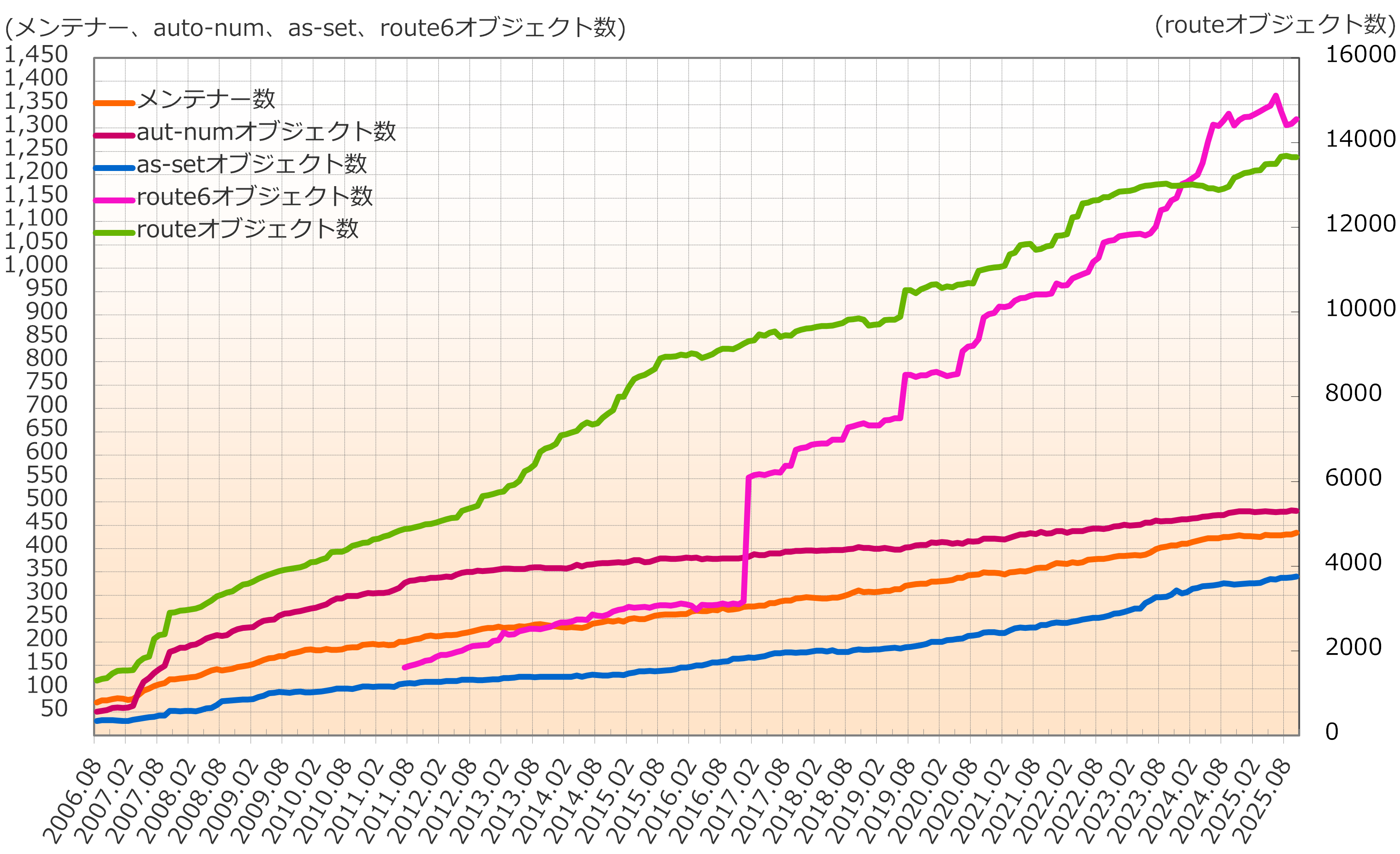 JPIRRにおける各オブジェクトの登録件数の推移です。 JPNICでは、JPNICからIPアドレスの割り振り・割り当て、 またはAS番号の割り当てを受けている組織に対し、 2006年8月よりこのサービスを提供しています。