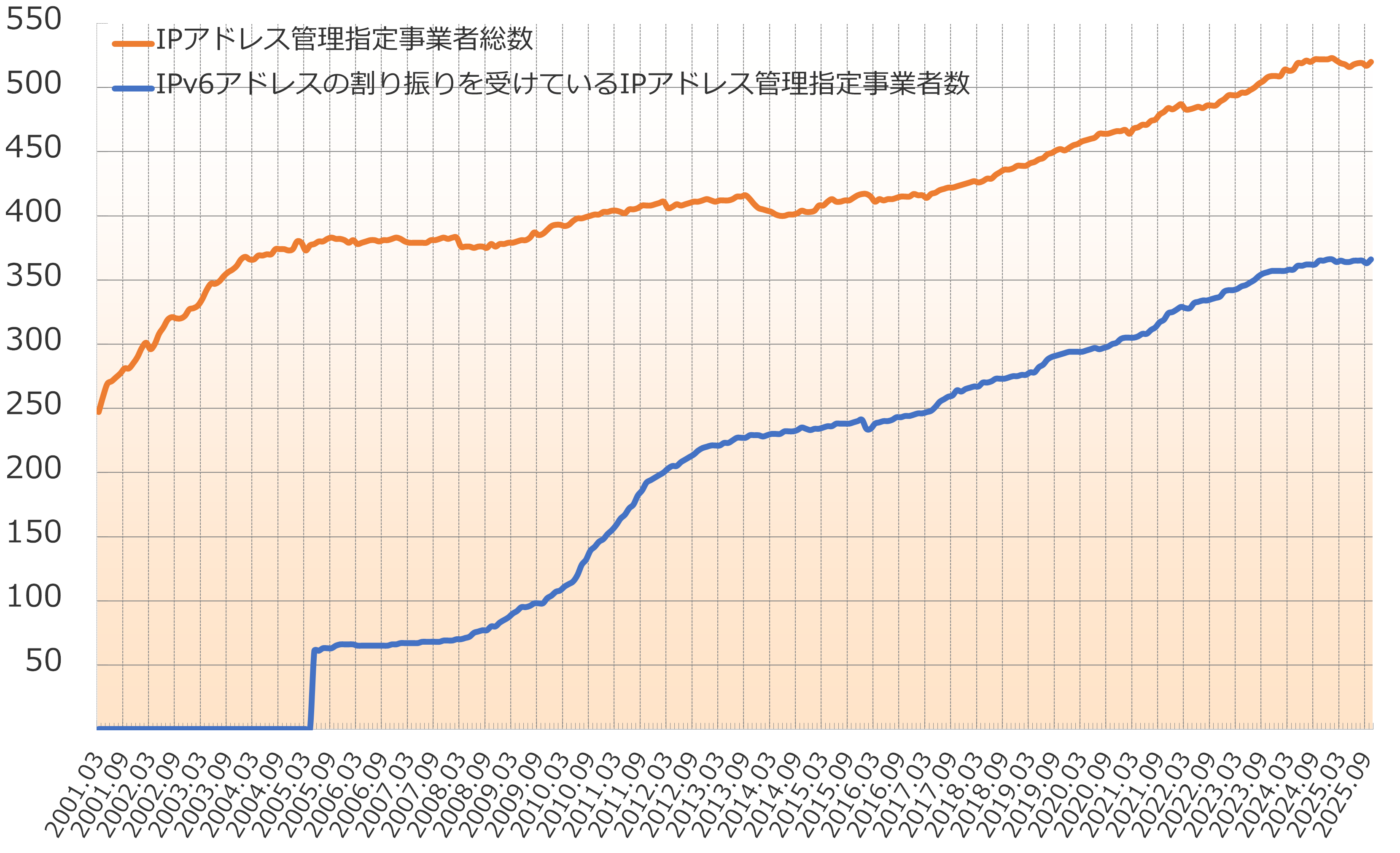 JPNICから直接IPアドレスの割り振りを受けている事業者数、 およびそのうちIPv6アドレスの割り振りを受けている事業者数の推移です。